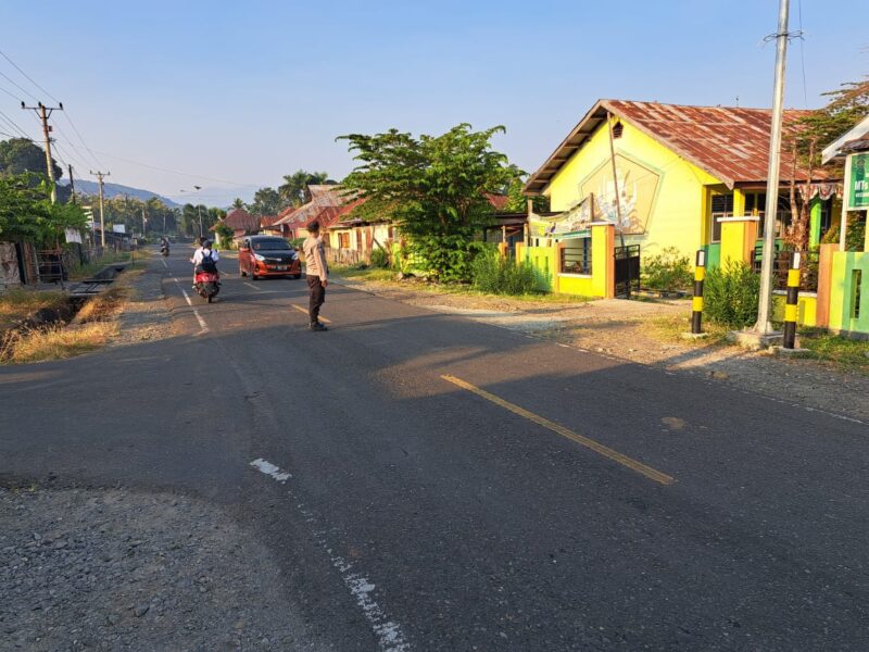 Dalam aksi yang terkoordinasi dengan baik, personil Polsek Ulubongka dengan sukarela menyeberangkan anak-anak sekolah dari sisi jalan yang ramai ke jalan seberangnya.