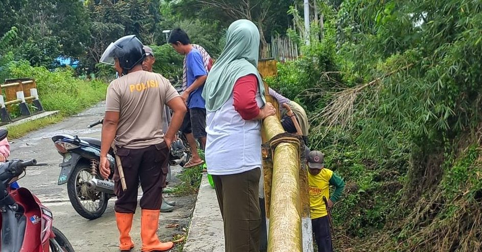 Kerja Bakti yang dilaksanakan oleh bhabinkamtibmas desa bulan jaya bersama warga masyarakat,untuk membersihkan kayu dan pohon yang tersangkut di tiang jembatan mengakibatkan aliran air sungai tertahan bisa meluap jika terjadi banjir.