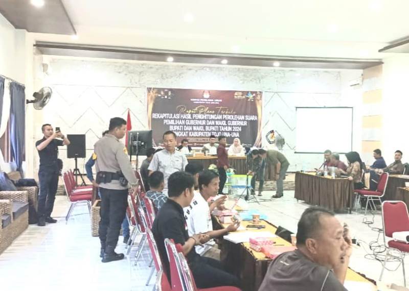 Ampana – Perhitungan suara tingkat Kecamatan berakhir, Personil Polres Tojo Una Una kembali mengamankan perhitungan suara tingkat Kabupaten yang saat ini sedang berlangsung di Ball Room Hotel Lawaka, Selasa (3/12/2024).