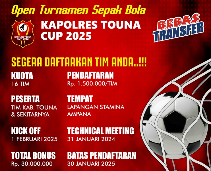 “Kuota terbatas, hanya untuk 16 tim terbaik yang mendapat kesempatan memperebutkan Piala Kapolres Touna 2025 dengan total bonus 30 juta rupiah,” jelasnya.