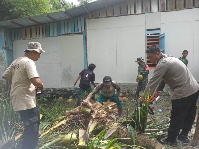 Kegiatan ini fokus pada pembersihan rumah warga yang rusak akibat tertimpa pohon tumbang setelah diterjang angin puting beliung.
