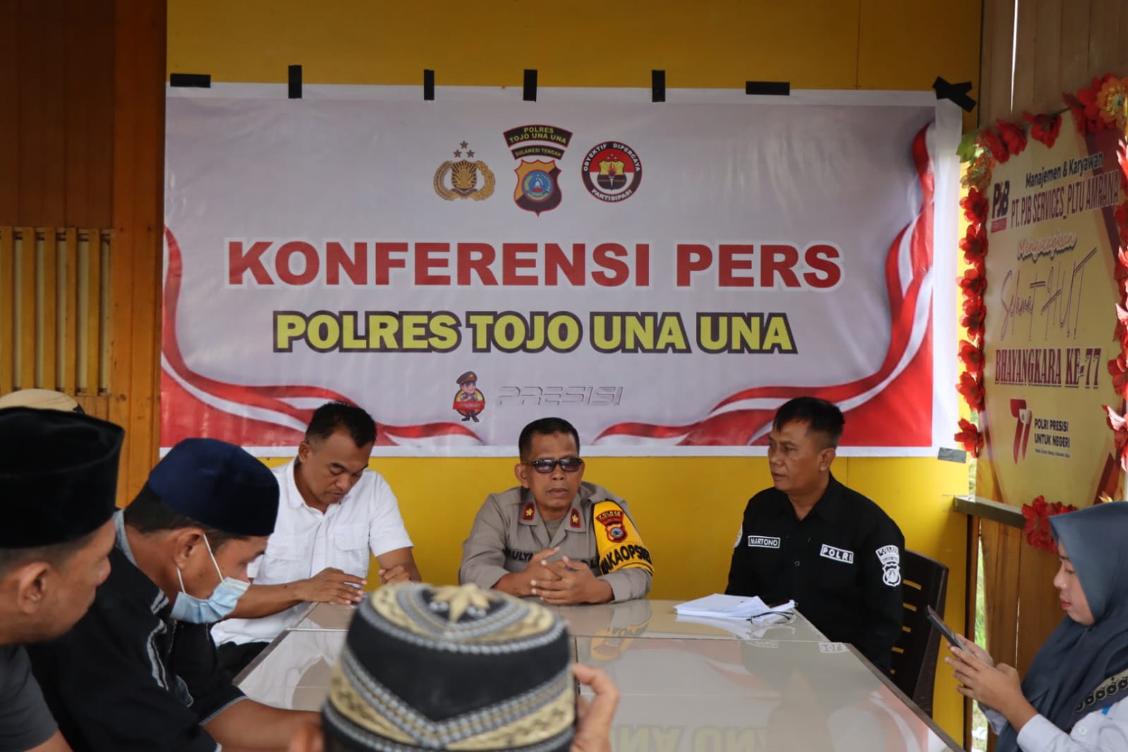 TOUNA – Wakapolres Tojo Una-Una Kompol Mulyadi, memimpin konferensi pers tentang pengungkapan dan keberhasilan penangkapan komplotan spesialis pencurian kabel power tower telekomunikasi yang beraksi di Desa Tongku, Kecamatan Tojo.